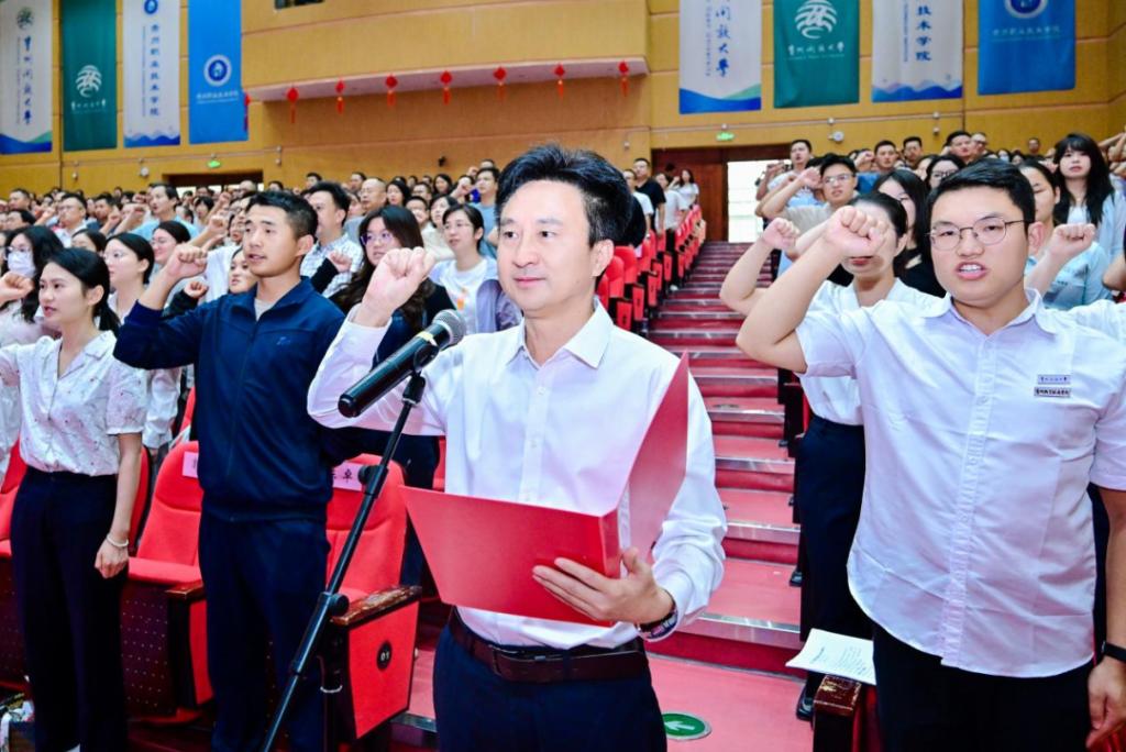 罗勇校长带领2025年新入职教师宣誓,全体教师重温教师誓词,誓言铿锵、坚定有力。